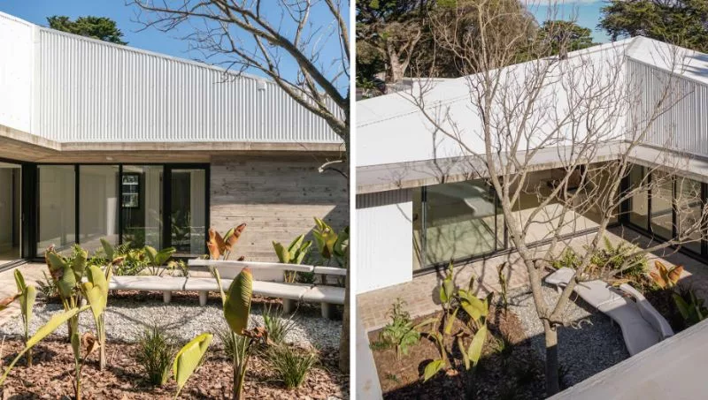 La estructura también presenta un diseño único con una galería separada del volumen principal, lo que permite un espacio exterior protegido adaptable a diferentes configuraciones, generando una gran flexibilidad en cuanto a la protección climática y la privacidad: "La idea de separar la galería del volumen principal de la casa, y a su vez que este espacio semi cubierto cuente con un sistema de postigones plegadizos, le da una impronta distintiva. Además, el uso de chapa sinusoidal blanca garantiza tanto la estética como el mantenimiento en un clima marítimo como el de Chapadmalal."