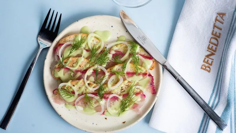 La carta de Benedetta es un recorrido completo por platos pensados para todos los paladares. Se comienza con diferentes raciones, como porotos alubia o berenjenas al escabeche; variedad de entradas, como croquetas de osobuco, gravlax de pesca blanca, pastrón de Benedetta o Ricota al Forno. Los principales viajan entre opciones veggies, cárnicas y pasta, con pulpo, quijada braseada, milanesa de bife angosto, de pesca del día o de berenjena, entre otros. Las guarniciones descansan en los vegetales, combinados de manera original, como las zanahorias quemadas con queso de cabra, avellanas y cilantro; el zucchini fresco con parmesano, menta y almendras, o el carpaccio de remolacha con patagonzola. La propuesta se completa con postres homemade, como mousse de chocolate, flan de dulce de leche argentino y helados caseros hechos in situ, como pistacho, sabayón, dulce de leche, fior di latte, ciruelas y manga. Además, los mediodías suman tartas y sándwiches. Toda la propuesta se acompaña de una carta de vinos de interesantes bodegas y coctelería clásica con aquellos tragos que nos encanta tomar.
