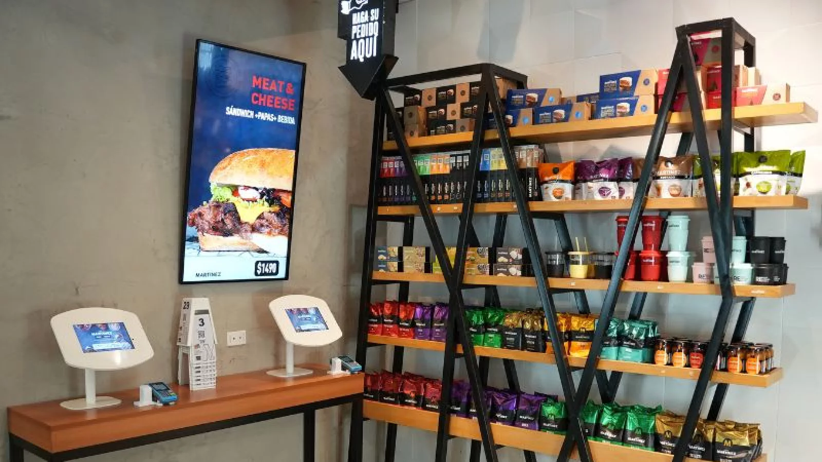 La cartelería digital y las pantallas de exhibición de este formato innovador de Café Martínez informan las propuestas y promociones según el momento del día, y las heladeras con pantalla transparente de última generación permiten contarle a los consumidores las cualidades de los productos.