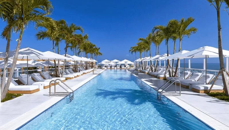 Con impresionantes vistas al mar, una gran piscina en la azotea de Miami y lujosas cabañas, la azotea del piso 18 está abierta desde el amanecer hasta el atardecer para que los huéspedes del hotel disfruten del tipo más exclusivo de nado frente al mar.