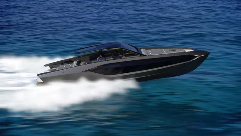 El 63 pies, que fue nombrado Best Weekend Cruiser en Best of the Best de Robb Report a principios de este año, lleva el ADN inconfundible de Lamborghini y fue fuertemente influenciado por los últimos superdeportivos de la marca. El estilo elegante se inspira en el hipercoche híbrido Sián FKP 37 de edición limitada, mientras que los asientos gemelos de cuero del timón son como los de un Huracán Evo. Incluso el panel de instrumentos y el volante reflejan los del Aventador. Otras similitudes incluyen líneas hexagonales afiladas, faros en forma de Y y un techo rígido similar a un superdeportivo. La estación de timón de estilo automotriz también ofrece una configuración de modo "Corsa" o "Carrera" al igual que un tablero Lambo.