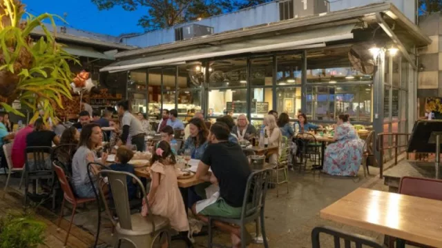 Si bien no es un restaurante en el sentido clásico, este enorme mercado de granjeros abierto solo los fines de semana permite a los visitantes comprar y cenar de una variedad de más de 600 vendedores, incluidos cerca de 200 puestos de comida y bebida, por lo que ciertamente hay mucha variedad para todos los gustos. Para los adultos, hay dos bares de cócteles, bandas en vivo y muchos televisores para ver algún evento deportivo.