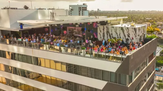 Desde el momento en que subes por el elevador que da a la calle SW 1st Court y te adentras en el espacio de Rosa Sky, te encuentras inmerso en un ambiente moderno y chic. El diseño del salón en la azotea combina elegancia con un toque vibrante, creando el escenario perfecto para momentos memorables.