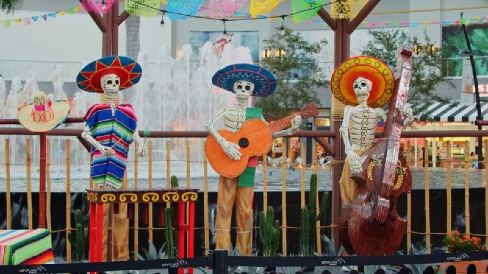 La entrada principal te recibe una calavera de madera y coloridos carteles de papel picado. Luego llegando a la Plaza de la Fuente, va a sorprenderte con un altar de un trío de catrines adornado con flores, caléndulas y más.