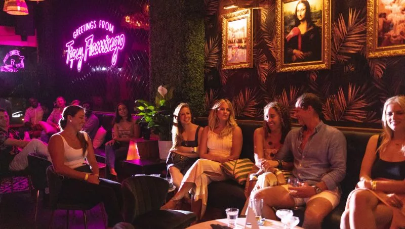 Ubicado en el corazón del centro de Miami, Tipsy Flamingo es un bar de cocktails inspirado en Miami de los creadores de Redbar y Sweet Caroline Karaoke Bar. El lugar está decorado con papel tapiz de hoja de palma vintage, toques de rosa fuerte y follaje falso. La carta de cocktails es como un homenaje a Miami con tragos como el “Downtown Mentirita”, la versión de Tipsy Flamingo del clásico Cuba Libre, y el “My English Is Not Very Good Looking”, que tiene el sabor de un pastelito de guayaba.