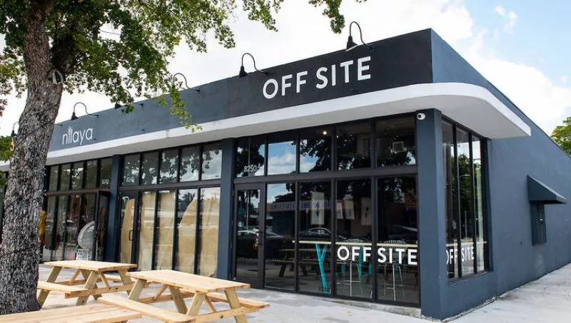 Parte microcervecería, parte oda a la cocina estadounidense, Off Site es una creación de Steve Santana, el hombre detrás de la popular taquería Taquiza con sede en Miami, y Adam Darnell de Boxelder de Wynwood. El espacio industrial relajado en Little River ofrece un menú conciso de clásicos estadounidenses mejorados como alitas ahumadas, sándwiches cubanos, una hamburguesa de short ribs, hot dogs extra grandes y el popular "Super Good Chicken Sandwich" de Santana, que se puede combinar con una variedad de lagers, IPA de todas las opciones, ámbar y rubias.