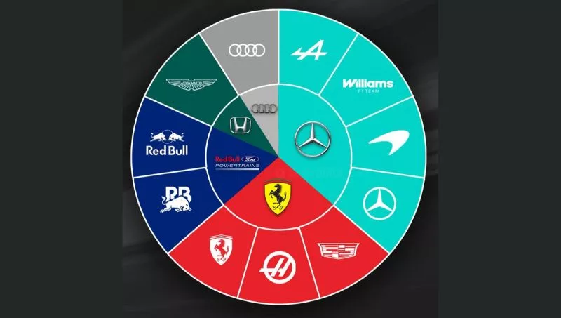 Este mapa no muestra proveedores. Muestra bloques de poder. Y hay un desbalance evidente: Mercedes controla el 36.4% de la parrilla. Pero eso es solo el 10% de la historia.