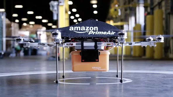 La compañía Amazon realizó en Cambridgeshire (Reino Unido) una prueba del servicio que denominó Amazon Prime Air y que pretende expandir en el futuro cercano. En el ensayo, un cliente llamado Richard B. compró un producto en la tienda online Amazon y recibió el paquete en su casa 13 minutos después mediante un dron. En este video, difundido por Amazon, se puede ver el proceso: