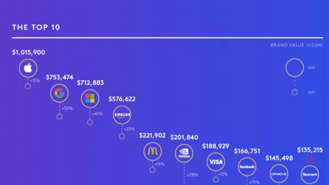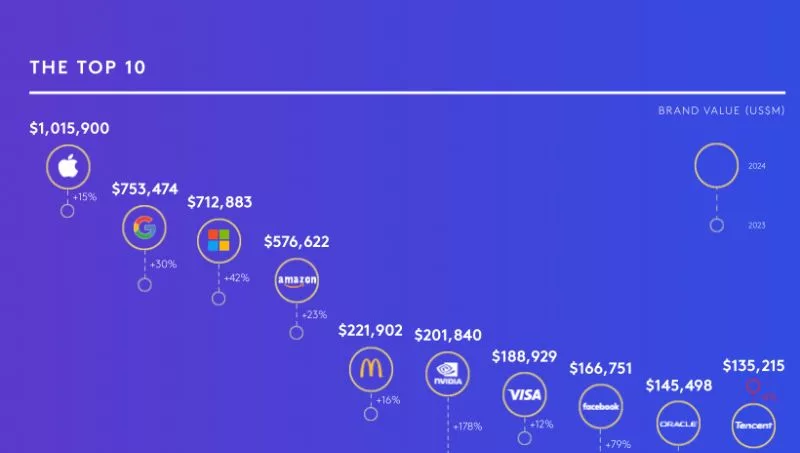Nvidia jumped 18 spots to sixth place with a 178% increase in brand value, attributed to the growing power of artificial intelligence.