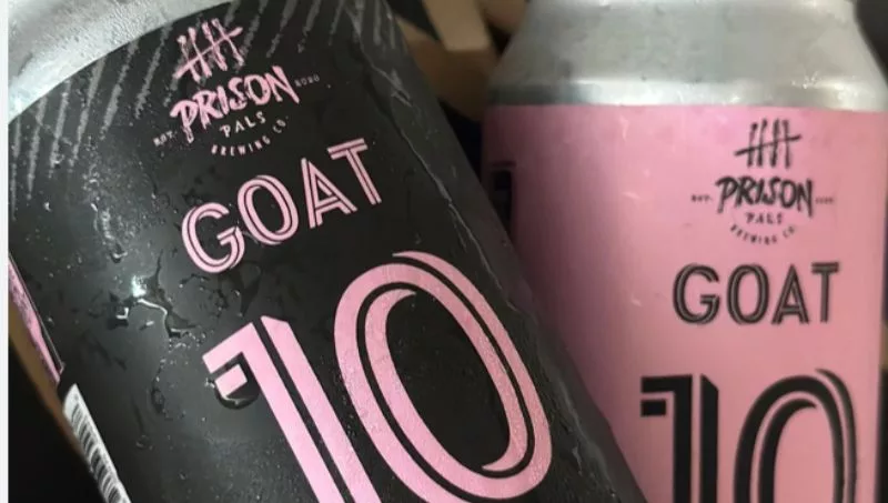 This beer is called "GOAT 10," a limited edition premium lager by Prison Pals Brewing Co, a brand founded by Argentinians in the United States. The can design combines black and pink colors, reflecting the colors associated with Inter Miami, the team where Messi and many other players are changing the history of Miami's football.