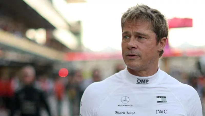 Pitt’s helmet featuring Mercedes, OMP, and Shark logos, mirroring real F1 driver designs like Lewis Hamilton.
