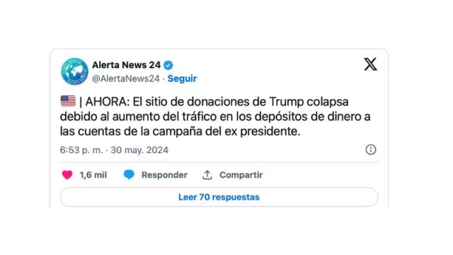 El sitio de donaciones de Donald Trump colapsó este jueves, luego de que el expresidente fuera declarado culpable. Este sitio colapsó debido al aumento del tráfico en los depósitos de dinero a las cuentas de la campaña del expresidente.
