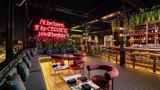 Para ingresar al restaurante, los comensales toman un ascensor privado hasta el restaurante de la terraza, donde caminarán a través del túnel revestido de mosaicos para ingresar al espacio, que cuenta con un techo retráctil que se extiende por todo el restaurante interior y exterior.