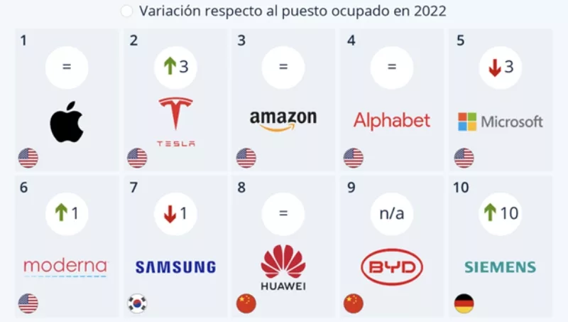 Tech companies dominate the top 50, despite the challenges faced by the technology industry in the past year. They continue to reign supreme in the rankings, with seven out of the top ten positions held by tech giants. Joining the race are innovative players in the transportation and energy sectors, like Tesla and BYD, as well as Moderna in the healthcare industry.