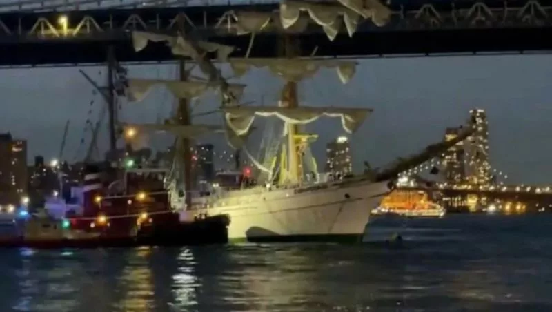 Danos e consequências: Apesar do impacto, o aparejo de aço evitou o colapso total dos mastros. A Guarda Costeira estabeleceu um perímetro de segurança de 46 metros ao redor do navio, que será reparado em dique seco.